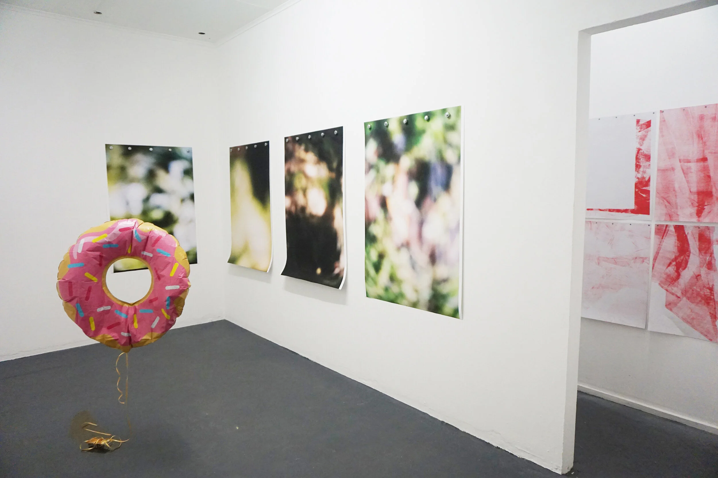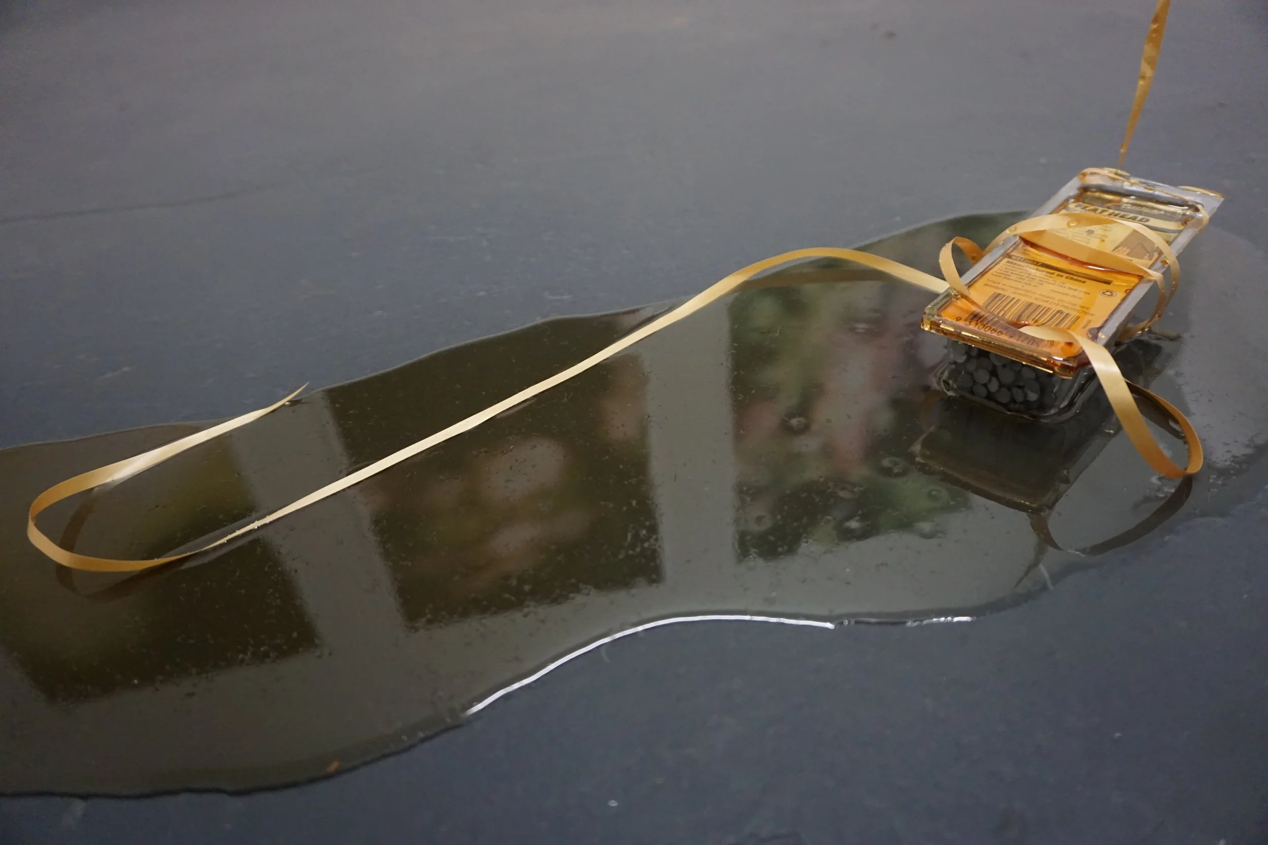 A large synthetic floating donut may be the most imposing object in the space. A kind of red herring, it takes on surreal qualities, suspended in air, and teases the viewer. Its descent and deterioration, however, is inevitable. Waiting below is a viscous and synthetic liquid, which, with